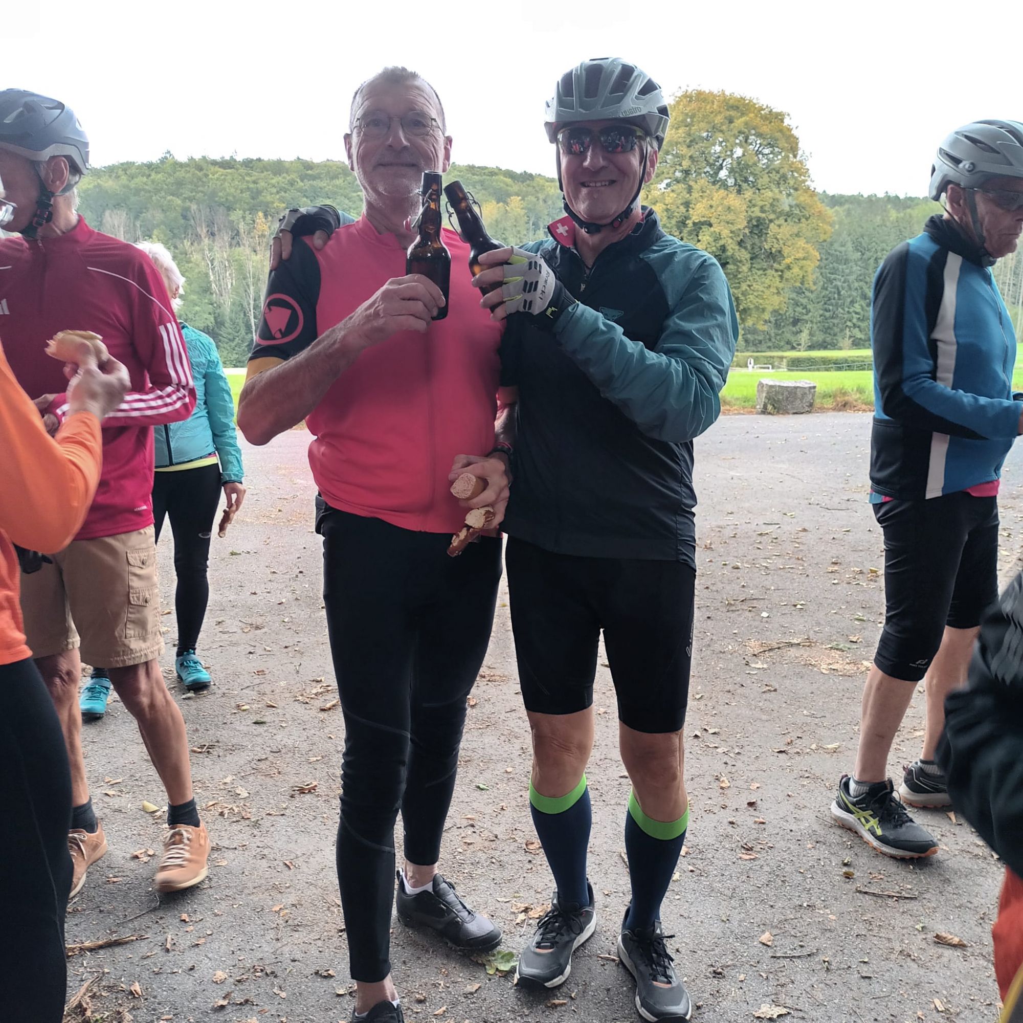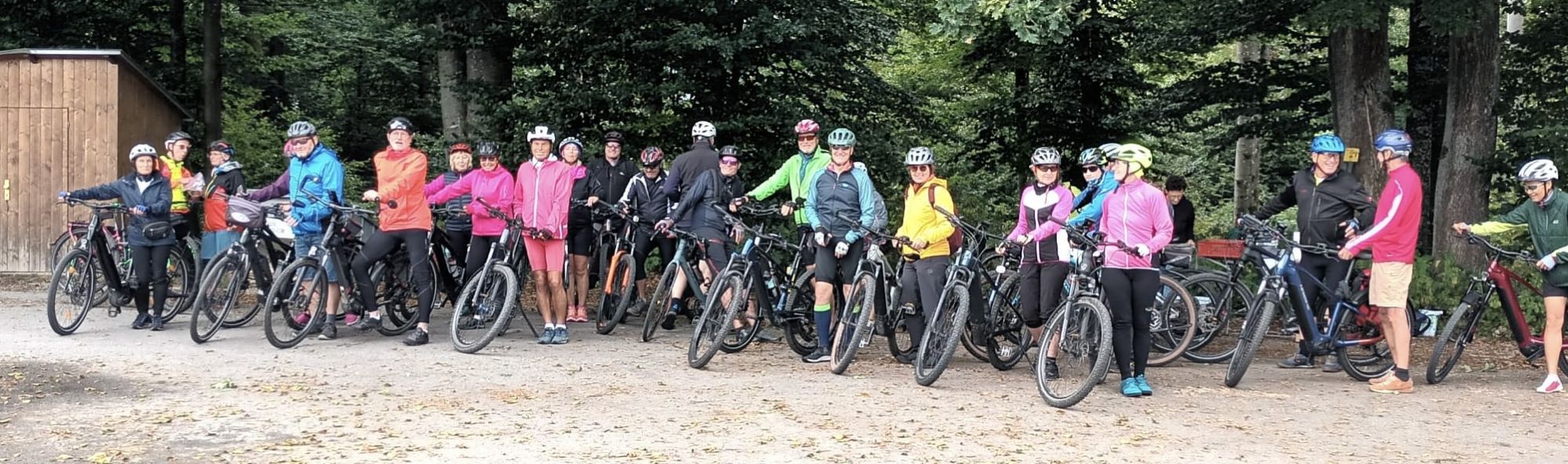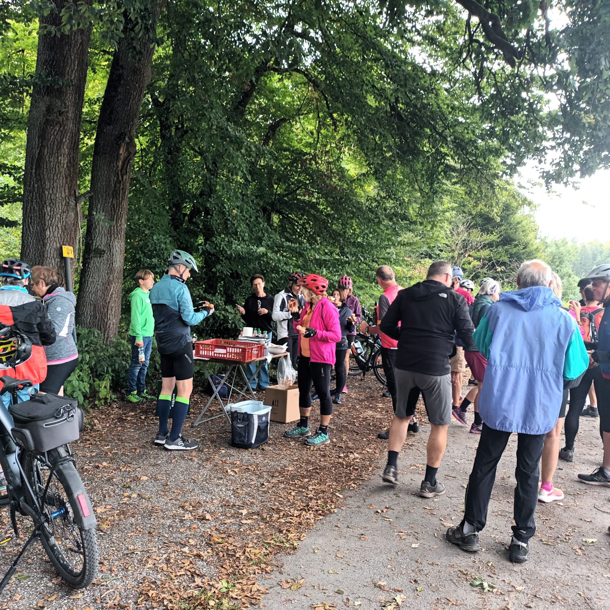 Los gings für die 28 Teilnehmer, überwiegend auf eBikes, um 11 Uhr vom Badhaus aus, bei leider wenig sommerlichen Temperaturen. Der einzige Bio-Biker war ein befreundeter Gast aus Kalifornien, der diesen Tag mit seinen bayrischen Freunden sehr genoss.