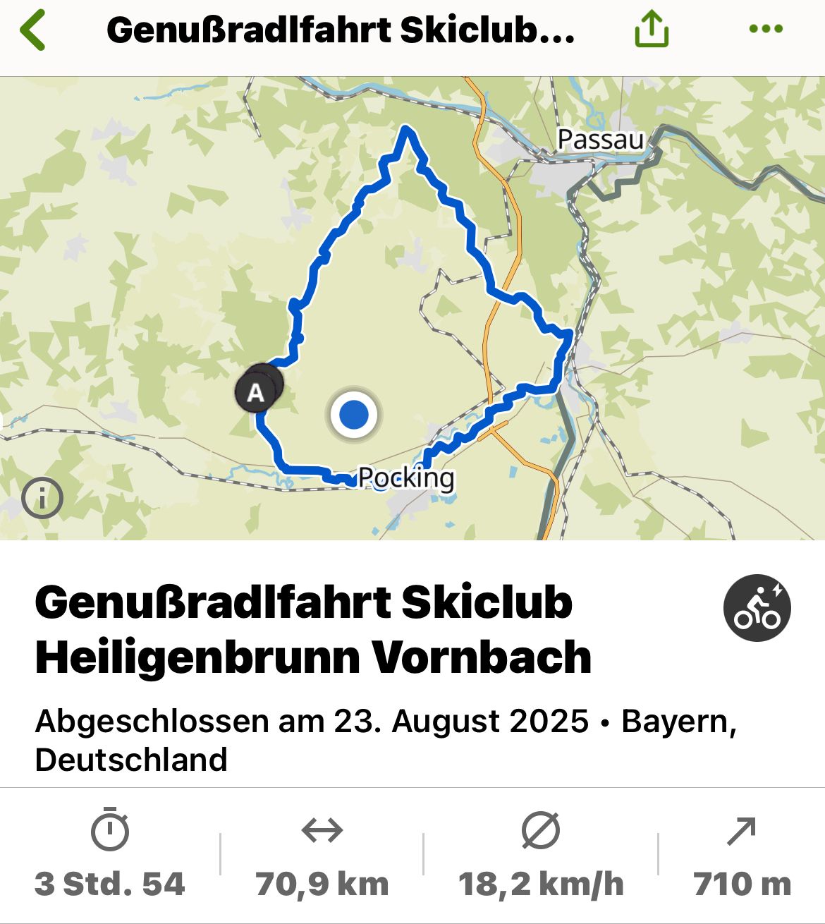 Weiter gings dann über die „Platte“ nach Neukirchen am Inn, dann über Rotthof nach Vornbach. Auf dem Innradweg dann über Rottau, Eggersham, Karpfham nach Griesbach zurück, insgesamt 70 km.